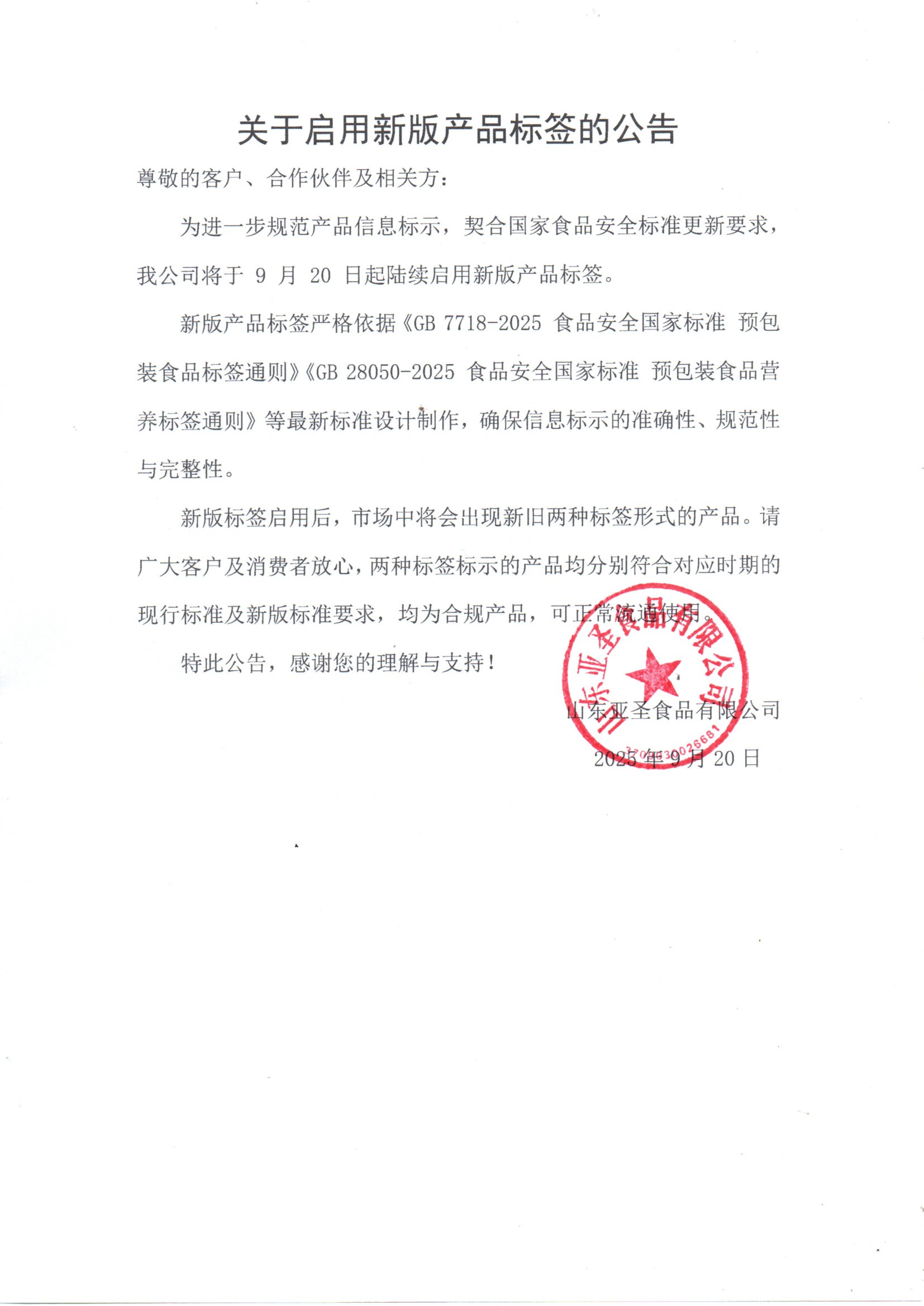【概要描述】尊敬的客户、合作伙伴及相关方: 为进一步规范产品信息标示,契合国家食品安全标准更新要求,我公司将于9月20日起陆续启用新版产品标签